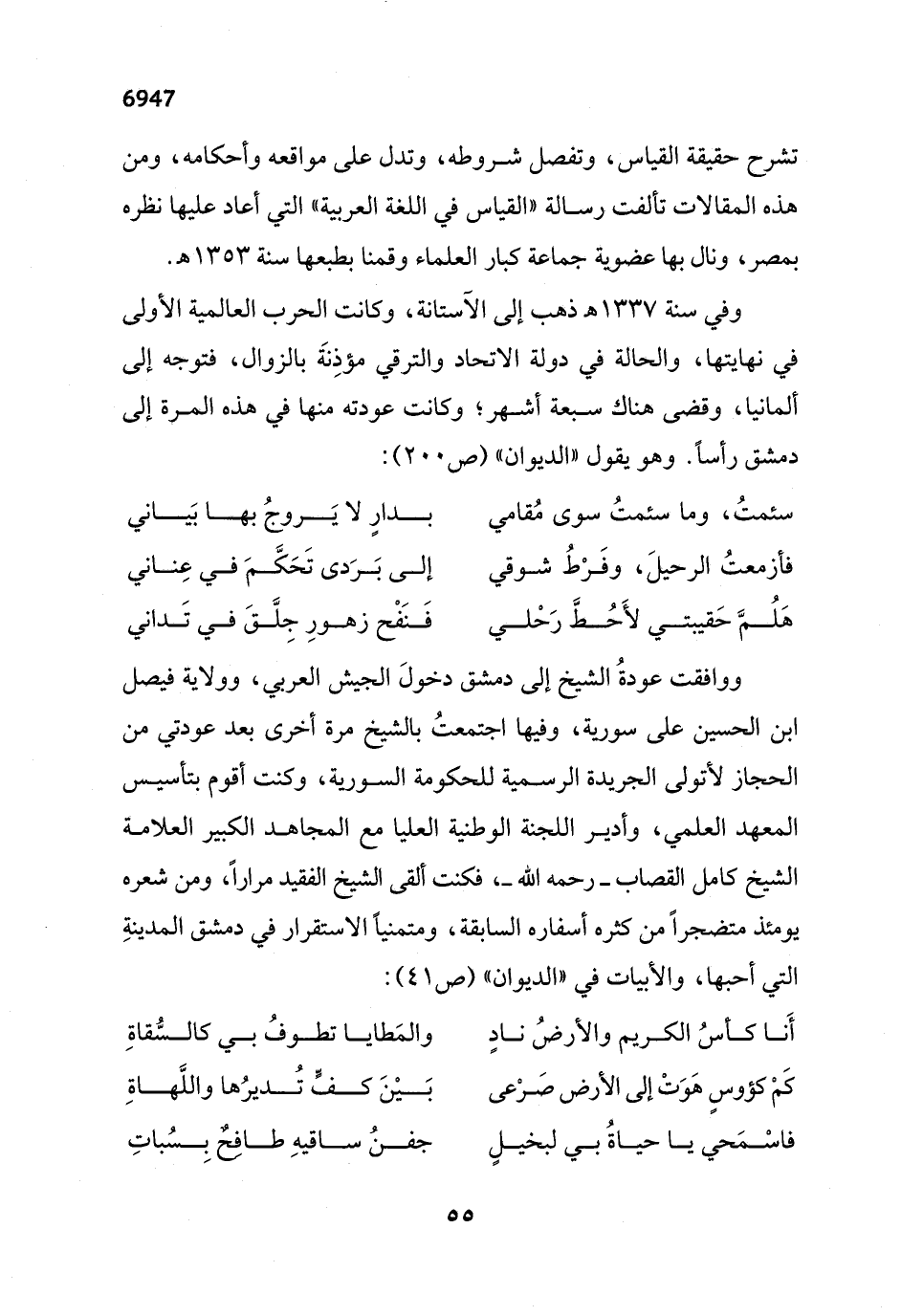 ووافقت عودةُ الشيخ إلى دمشق دخولَ الجيش العربي، وولاية فيصل ابن الحسين على سورية، وفيها اجتمعتُ بالشيخ مرة أخرى بعد عودتي من الحجاز لأتولى الجريدة الرسمية للحكومة السورية، وكنت أقوم بتأسيس المعهد العلمي، وأدير اللجنة الوطنية العليا مع المجاهد الكبير العلامة الشيخ كامل القصاب -رحمه الله- فكنت ألقى الشيخ الفقيد مراراً، ومن شعره يومئذ متضجراً من كثره أسفاره السابقة، ومتمنياً الاستقرار في دمشق المدينةِ التي أحبها، والأبيات في "الديوان" (ص 41):