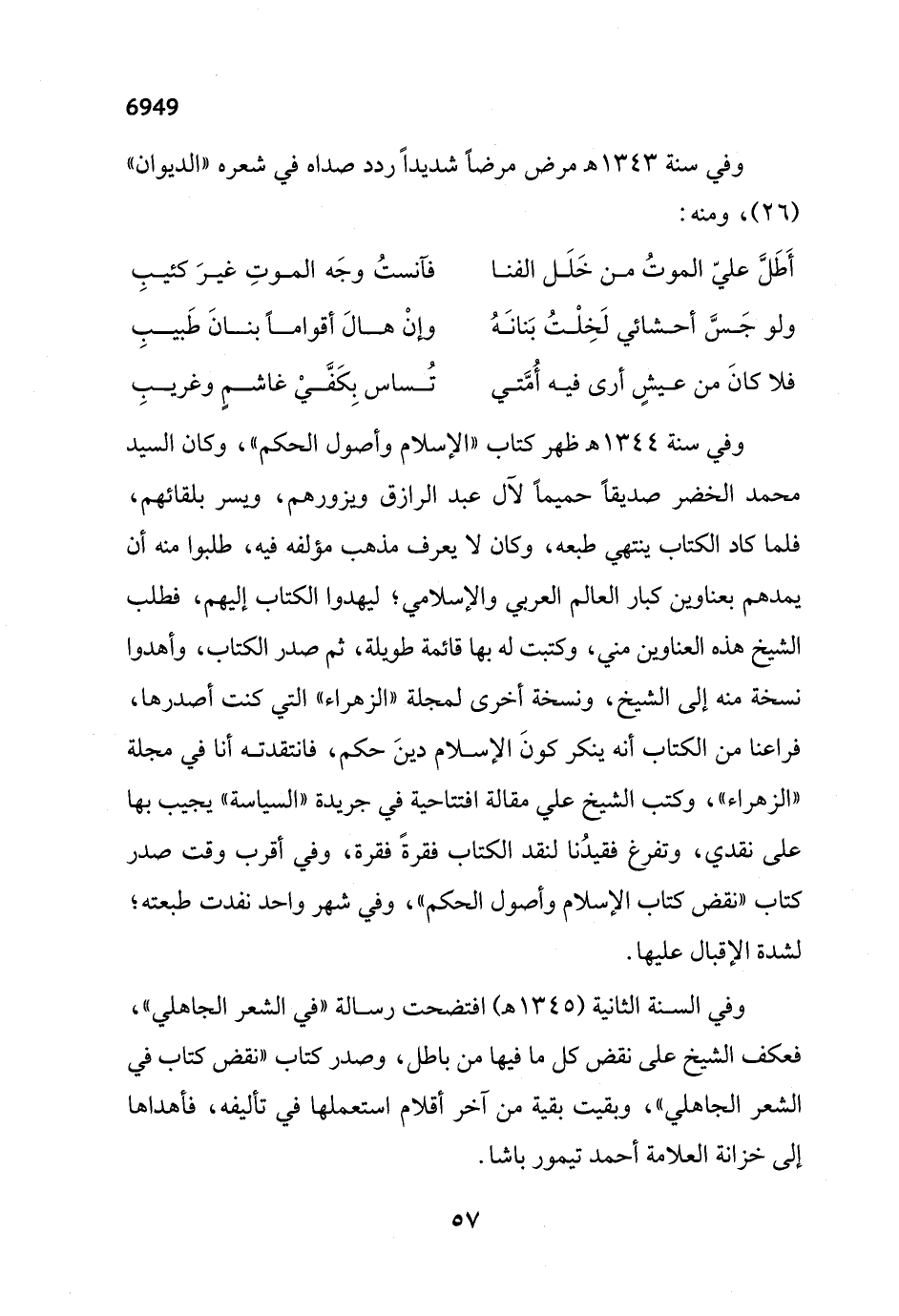 وفي السنة الثانية (1345 هـ) افتضحت رسالة "في الشعر الجاهلي"، فعكف الشيخ على نقض كل ما فيها من باطل، وصدر كتاب "نقض كتاب في الشعر الجاهلي"، وبقيت بقية من آخر أقلام استعملها في تأليفه، فأهداها إلى خزانة العلامة أحمد تيمور باشا.