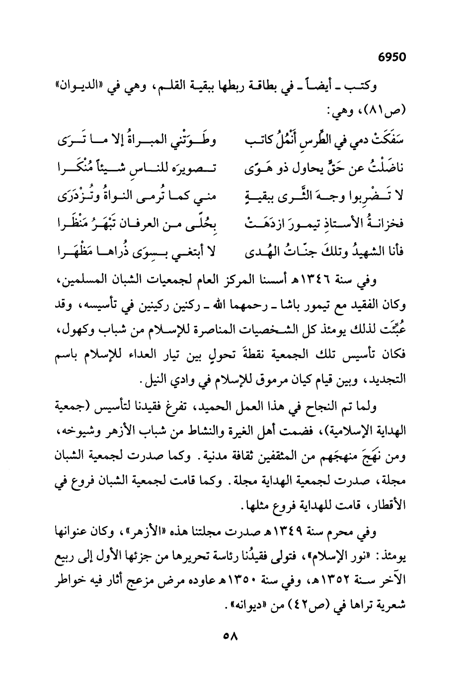 وفي سنة 1346 هـ أسسنا المركز العام لجمعيات الشبان المسلمين، وكان الفقيد مع تيمور باشا -رحمهما الله- ركنين ركينين في تأسيسه، وقد عُبِّئَت لذلك يومئذ كل الشخصيات المناصرة للإسلام من شباب وكهول، فكان تأسيس تلك الجمعية نقطةَ تحولٍ بين تيار العداء للإسلام باسم التجديد، وبين قيام كيان مرموق للإسلام في وادي النيل.