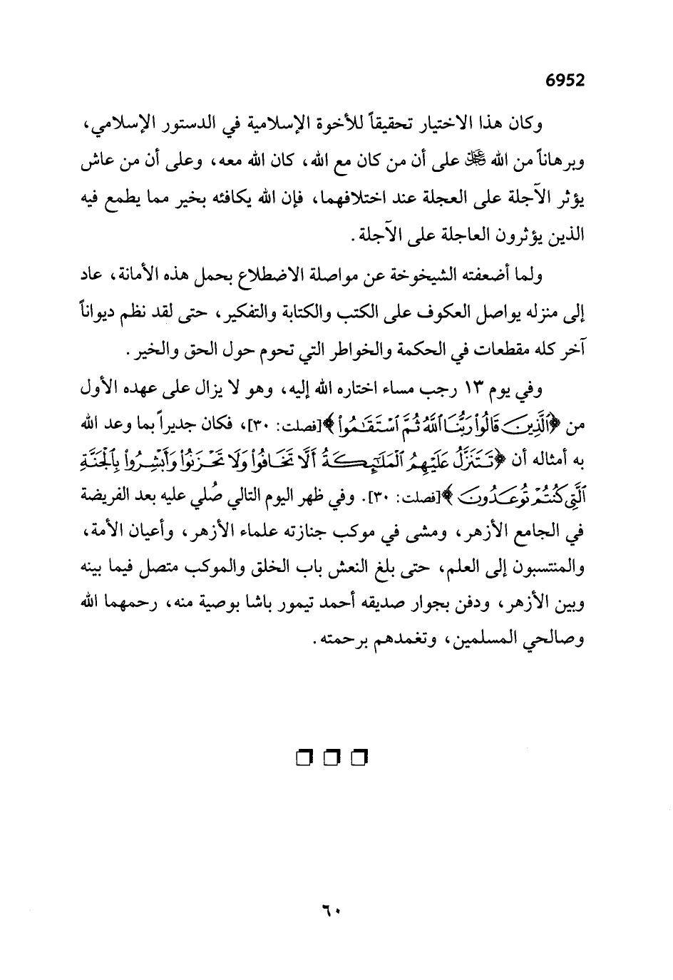 وفي يوم 13 رجب مساء اختاره الله إليه، وهو لا يزال على عهده الأول من {إِنَّ الَّذِينَ قَالُوا رَبُّنَا اللَّهُ ثُمَّ اسْتَقَامُوا} [فصلت: 30]، فكان جديرًا بما وعد الله به أمثاله أن {تَتَنَزَّلُ عَلَيْهِمُ الْمَلَائِكَةُ أَلَّا تَخَافُوا وَلَا تَحْزَنُوا وَأَبْشِرُوا بِالْجَنَّةِ الَّتِي كُنْتُمْ تُوعَدُونَ} [فصلت: 30]. وفي ظهر اليوم التالي صُلي عليه بعد الفريضة في الجامع الأزهر، ومشى في موكب جنازته علماء الأزهر، وأعيان الأمة، والمنتسبون إلى العلم، حتى بلغ النعش باب الخلق والموكب متصل فيما بينه وبين الأزهر، ودفن بجوار صديقه أحمد تيمور باشا بوصية منه، رحمهما الله وصالحي المسلمين، وتغمدهم برحمته.