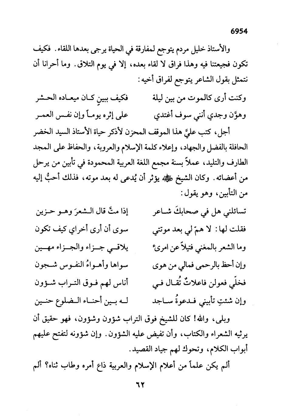 وبلى، والله! كان للشيخ فوق التراب شؤون وشؤون، فهو حقيق أن يرثيه الشعراء والكتاب، وأن تفيض عليه الشؤون. وإن شؤونه لتفتح عليهم أبواب الكلام، وتحوك لهم جياد القصيد.