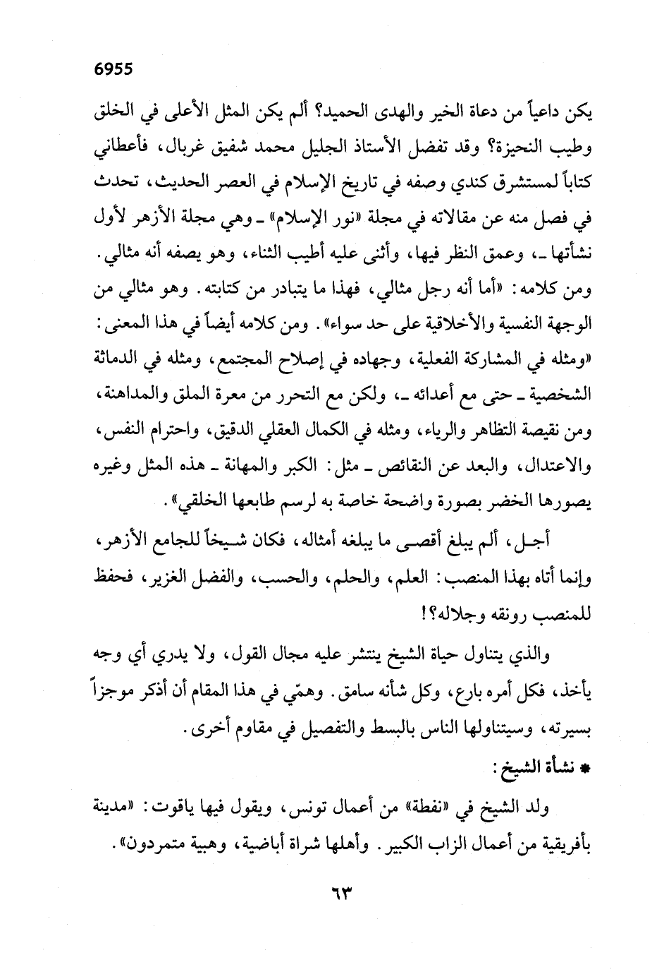 يكن داعياً من دعاة الخير والهدى الحميد؟ ألم يكن المثل الأعلى في الخلق وطيب النحيزة؟ وقد تفضل الأستاذ الجليل محمد شفيق غربال، فأعطاني كتاباً لمستشرق كندي وصفه في تاريخ الإِسلام في العصر الحديث، تحدث في فصل منه عن مقالاته في مجلة "نور الإِسلام" -وهي مجلة الأزهر لأول نشأتها-، وعمق النظر فيها، وأثنى عليه أطيب الثناء، وهو يصفه أنه مثالي. ومن كلامه: "أما أنه رجل مثالي، فهذا ما يتبادر من كتابته. وهو مثالي من الوجهة النفسية والأخلاقية على حد سواء". ومن كلامه أيضاً في هذا المعنى: "ومثله في المشاركة الفعلية، وجهاده في إصلاح المجتمع، ومثله في الدماثة الشخصية -حتى مع أعدائه-، ولكن مع التحرر من معرة الملق والمداهنة، ومن نقيصة التظاهر والرياء، ومثله في الكمال العقلي الدقيق، واحترام النفس، والاعتدال، والبعد عن النقائص -مثل: الكبر والمهانة- هذه المثل وغيره يصورها الخضر بصورة واضحة خاصة به لرسم طابعها الخلقي".