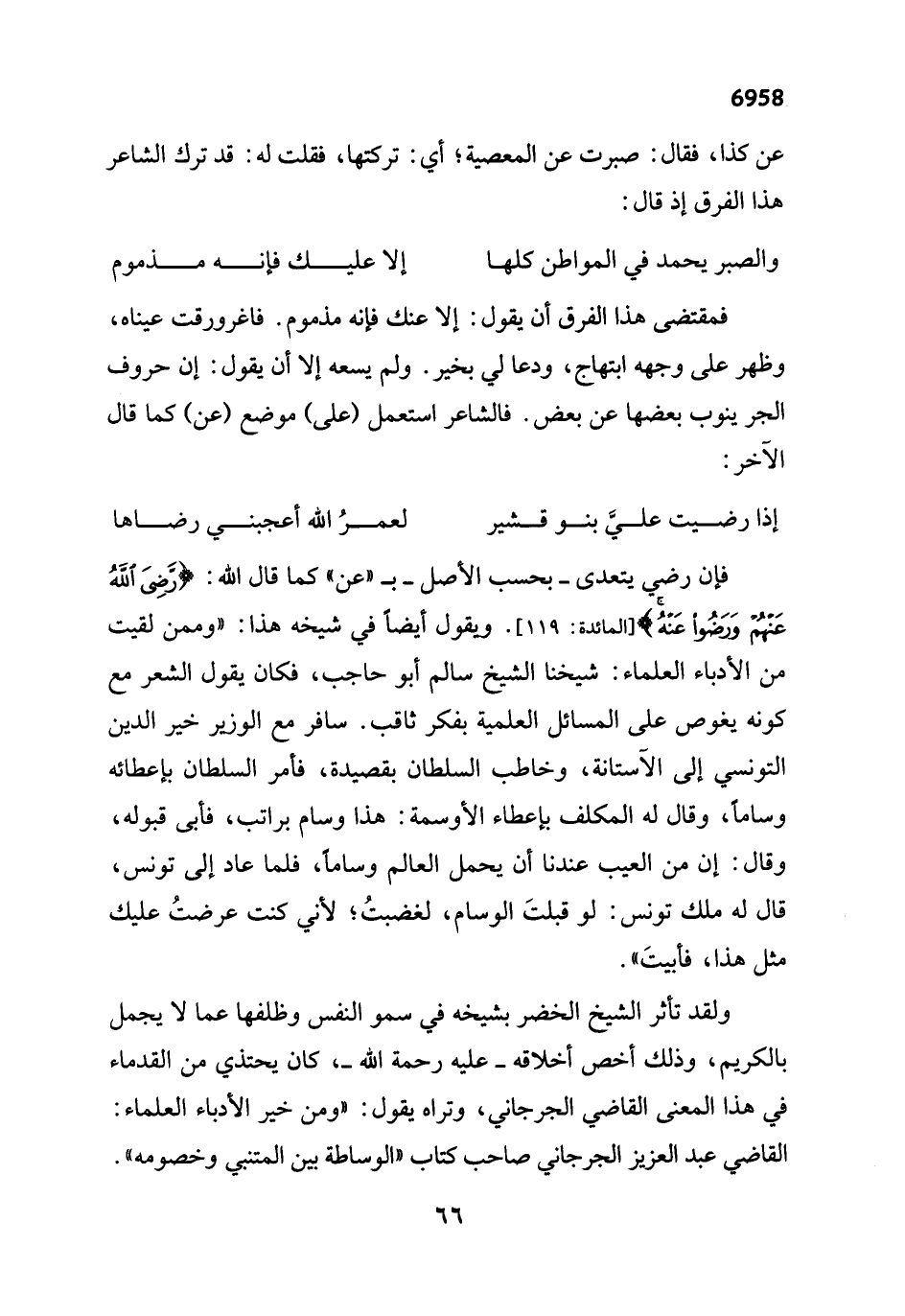 فإن رضي يتعدى -بحسب الأصل- بـ "عن" كما قال الله: {رَضِيَ اللَّهُ عَنْهُمْ وَرَضُوا عَنْهُ} [المائدة: 119]. ويقول أيضاً في شيخه هذا: "وممن لقيت من الأدباء العلماء: شيخنا الشيخ سالم أبو حاجب، فكان يقول الشعر مع كونه يغوص على المسائل العلمية بفكر ثاقب. سافر مع الوزير خير الدين التونسي إلى الآستانة، وخاطب السلطان بقصيدة، فأمر السلطان بإعطائه وسامًا، وقال له المكلف بإعطاء الأوسمة: هذا وسام براتب، فأبى قبوله، وقال: إن من العيب عندنا أن يحمل العالم وساماً، فلما عاد إلى تونس، قال له ملك تونس: لو قبلتَ الوسام، لغضبتُ؛ لأني كنت عرضتُ عليك مثل هذا، فأبيتَ".