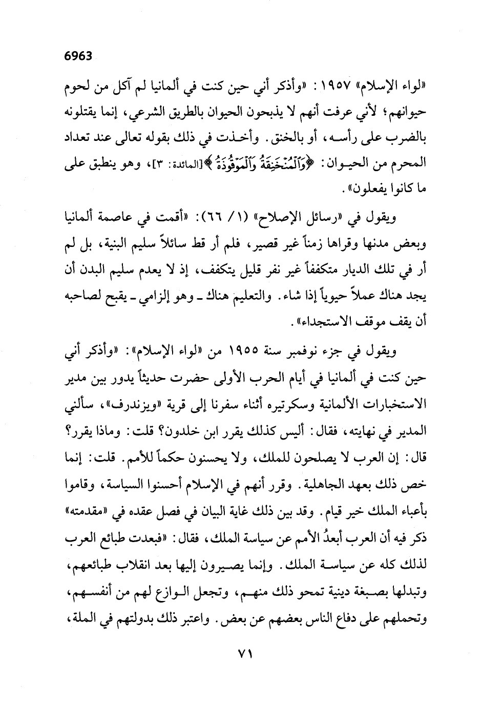 "لواء الإِسلام " 1957: "وأذكر أني حين كنت في ألمانيا لم آكل من لحوم حيوانهم؛ لأني عرفت أنهم لا يذبحون الحيوان بالطريق الشرعي، إنما يقتلونه بالضرب على رأسه، أو بالخنق. وأخذت في ذلك بقوله تعالى عند تعداد المحرم من الحيوان: {وَالْمُنْخَنِقَةُ وَالْمَوْقُوذَةُ} [المائدة: 3]، وهو ينطبق على ما كانوا يفعلون".