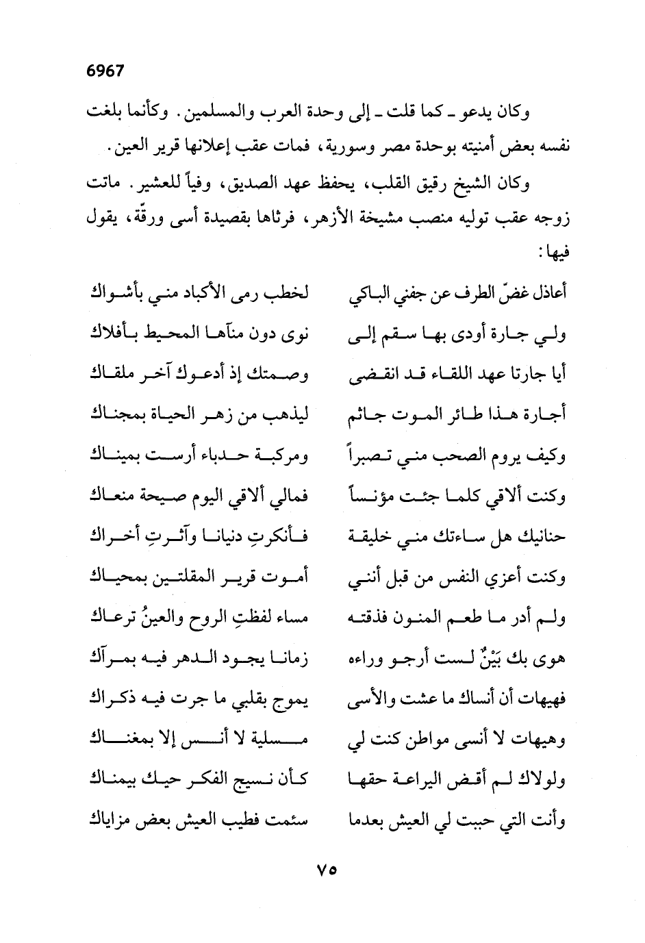 وكان يدعو -كما قلت- إلى وحدة العرب والمسلمين. وكأنما بلغت نفسه بعض أمنيته بوحدة مصر وسورية، فمات عقب إعلانها قرير العين.