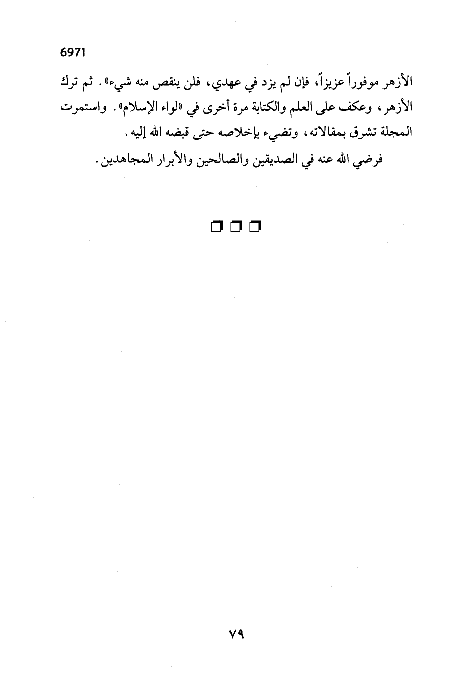الأزهر موفوراً عزيزاً، فإن لم يزد في عهدي، فلن ينقص منه شيء". ثم ترك الأزهر، وعكف على العلم والكتابة مرة أخرى في "لواء الإِسلام". واستمرت المجلة تشرق بمقالاته، وتضيء بإخلاصه حتى قبضه الله إليه.