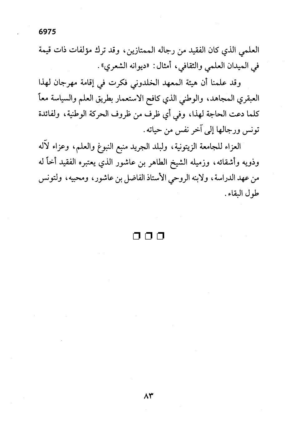 العزاء للجامعة الزيتونية، ولبلد الجريد منبع النبوغ والعلم، وعزاء لآله وذويه وأشقائه، وزميله الشيخ الطاهر بن عاشور الذي يعتبره الفقيد أخاً له من عهد الدراسة، ولابنه الروحي الأستاذ الفاضل بن عاشور، ومحبيه، ولتونس طول البقاء.