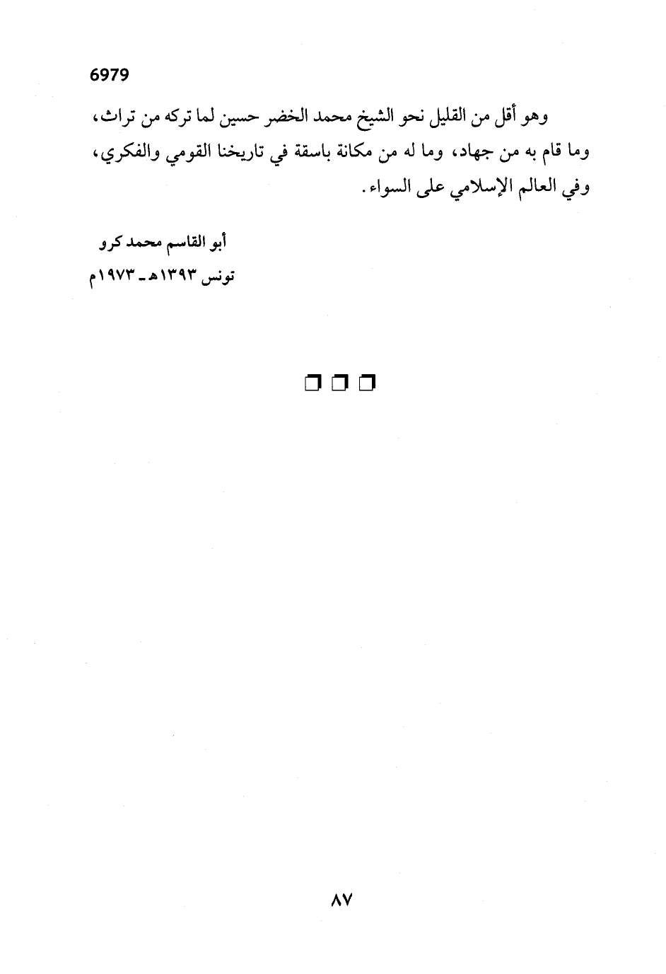 وهو أقل من القليل نحو الشيخ محمد الخضر حسين لما تركه من تراث، وما قام به من جهاد، وما له من مكانة باسقة في تاريخنا القومي والفكري، وفي العالم الإِسلامي على السواء.