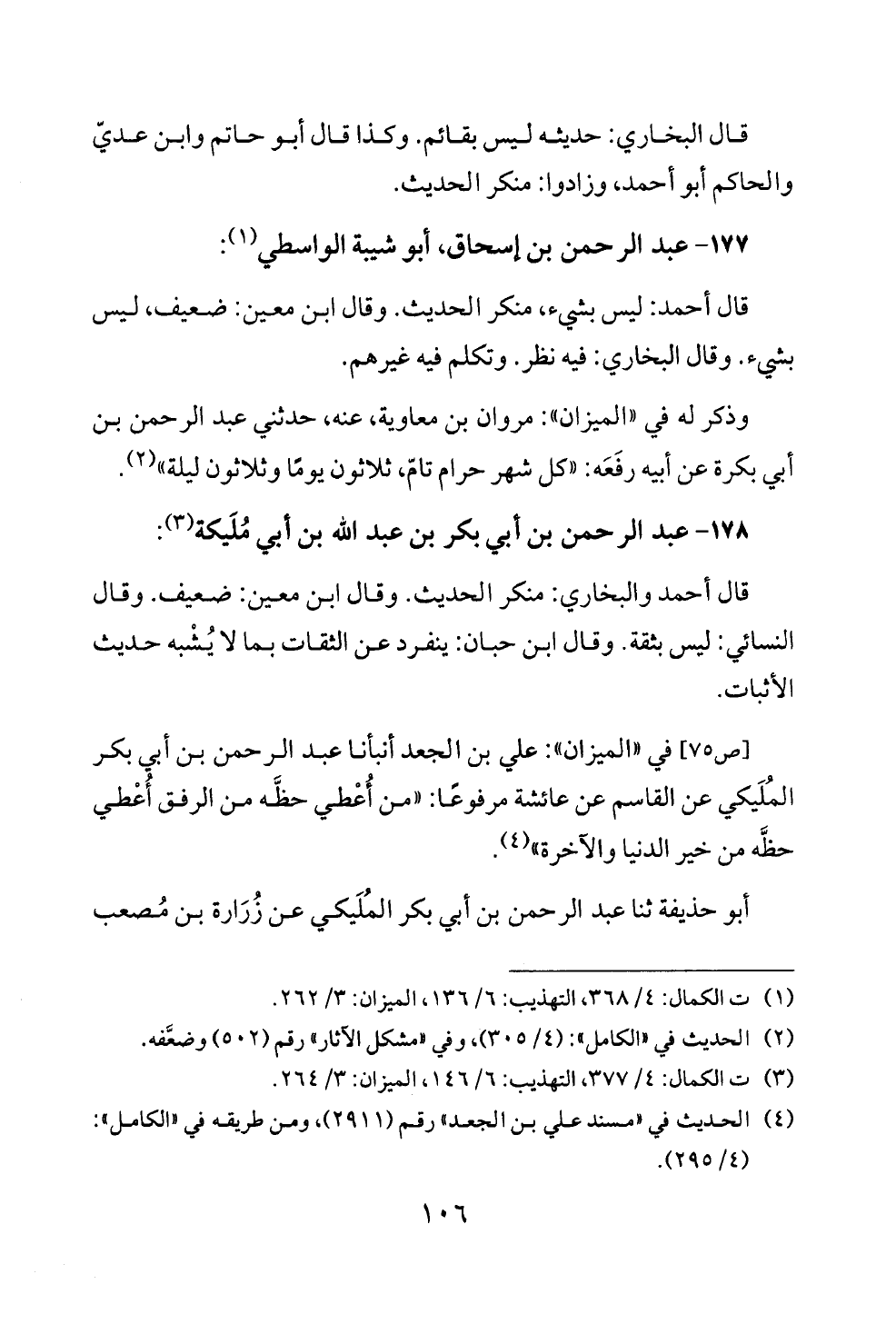 [ص ٧٥] في «الميزان»: علي بن الجعد أنبأنا عبد الرحمن بن أبي بكر المُلَيكي عن القاسم عن عائشة مرفوعًا: «من أُعْطي حظَّه من الرفق أُعْطي حظَّه من خير الدنيا والآخرة» (¬٤).