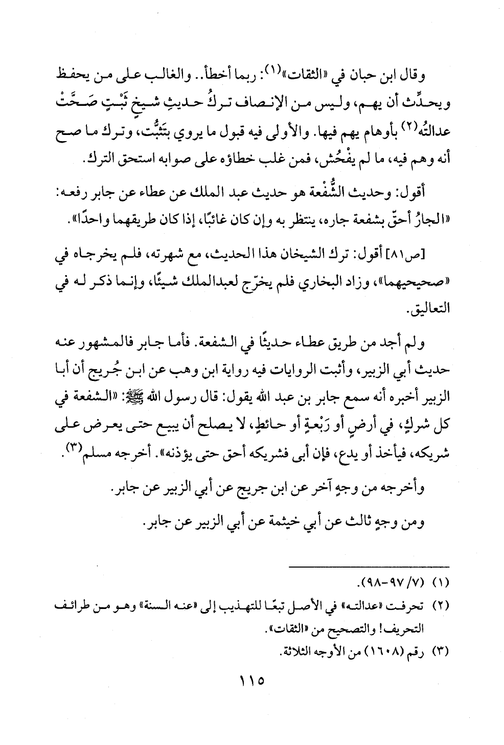 [ص ٨١] أقول: ترك الشيخان هذا الحديث، مع شهرته، فلم يخرجاه في «صحيحيهما»، وزاد البخاري فلم يخرّج لعبدالملك شيئًا، وإنما ذكر له في التعاليق.