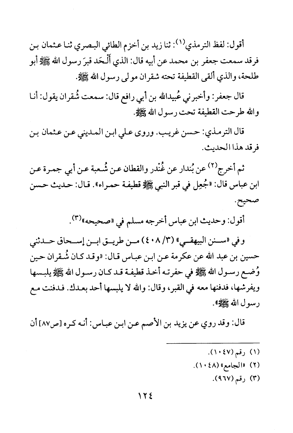 ثم أخرج (¬٢) عن بُندار عن غُنْدر والقطان عن شُعبة عن أبي جمرة عن ابن عباس قال: «جُعِل في قبر النبي - صلى الله عليه وسلم - قطيفة حمراء». قال: حديث حسن صحيح.