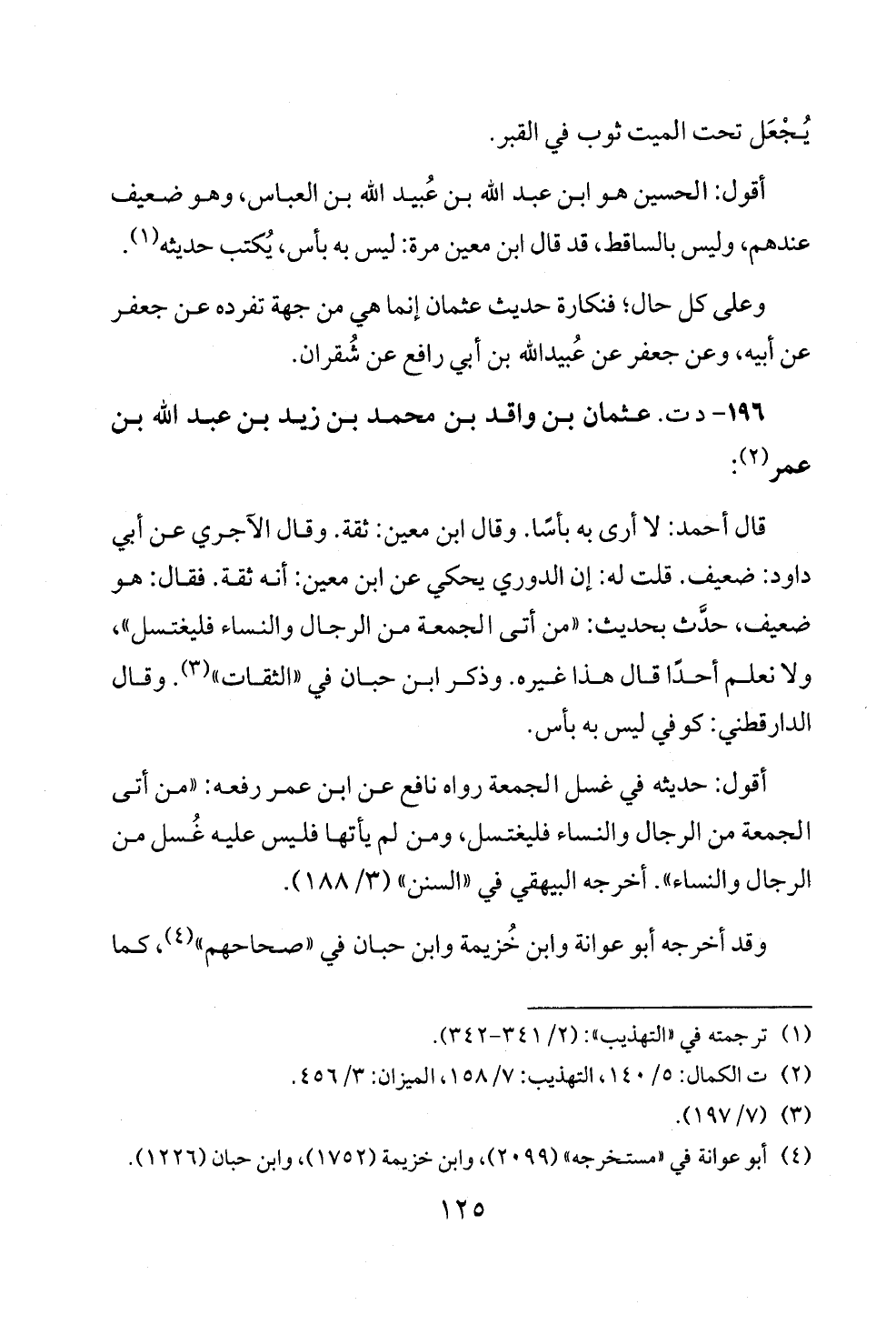 أقول: حديثه في غسل الجمعة رواه نافع عن ابن عمر رفعه: «من أتى الجمعة من الرجال والنساء فليغتسل، ومن لم يأتها فليس عليه غُسل من الرجال والنساء». أخرجه البيهقي في «السنن» (٣/ ١٨٨).