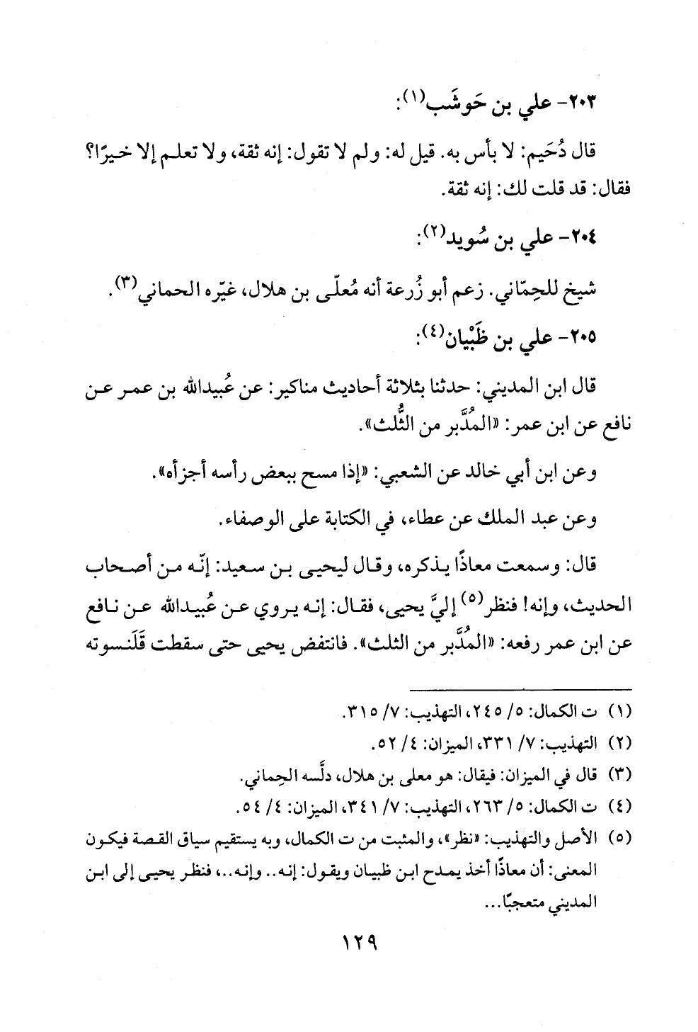 (¬٥) الأصل والتهذيب: «نظر»، والمثبت من ت الكمال، وبه يستقيم سياق القصة فيكون المعنى: أن معاذًا أخذ يمدح ابن ظبيان ويقول: إنه .. وإنه .. ، فنظر يحيى إلى ابن المديني متعجبًا ...