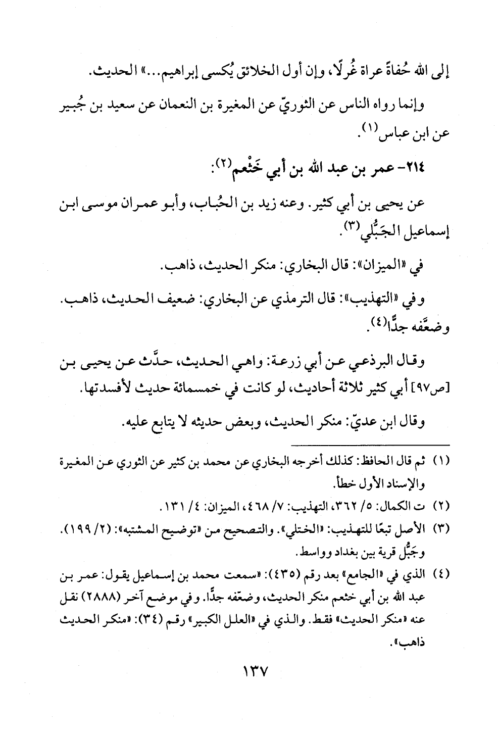 (¬٤) الذي في «الجامع» بعد رقم (٤٣٥): «سمعت محمد بن إسماعيل يقول: عمر بن عبد الله بن أبي خثعم منكر الحديث، وضعّفه جدًّا. وفي موضع آخر (٢٨٨٨) نقل عنه «منكر الحديث» فقط. والذي في «العلل الكبير» رقم (٣٤): «منكر الحديث ذاهب».