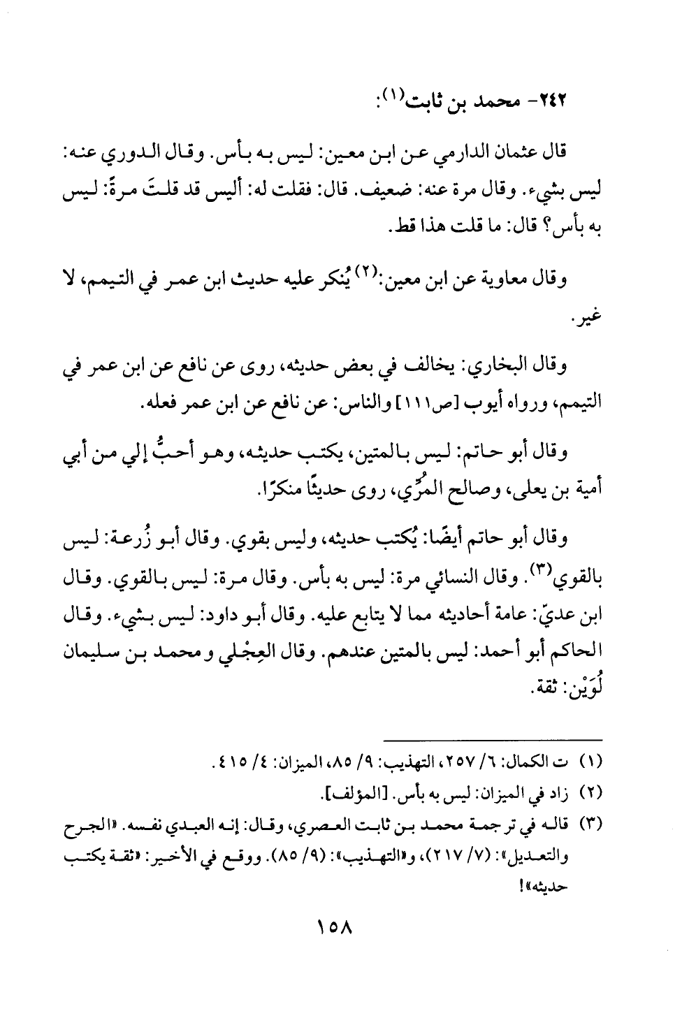 (¬٣) قاله في ترجمة محمد بن ثابت العصري، وقال: إنه العبدي نفسه. «الجرح والتعديل»: (٧/ ٢١٧)، و «التهذيب»: (٩/ ٨٥). ووقع في الأخير: «ثقة يكتب حديثه»!