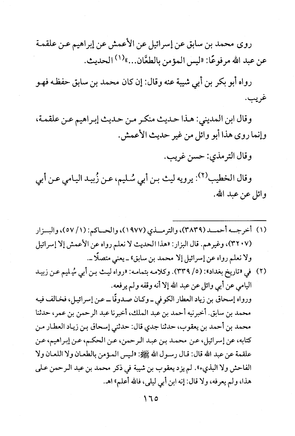 روى محمد بن سابق عن إسرائيل عن الأعمش عن إبراهيم عن علقمة عن عبد الله مرفوعًا: «ليس المؤمن بالطعَّان ... » (¬١) الحديث.