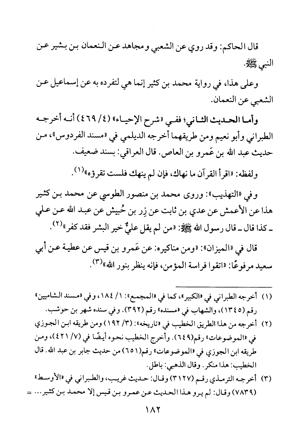 (¬٣) أخرجه الترمذي رقم (٣١٢٧) وقال: حديث غريب، والطبراني في «الأوسط» (٧٨٣٩) وقال: لم يرو هذا الحديث عن عمرو بن قيس إلا محمد بن كثير ... والعقيلي في «الضعفاء»: (٤/ ١٢٩). وانظر كلام المصنف عليه في تعليقه على «الفوائد المجموعة»: (ص/٢٤٣) للشوكاني.