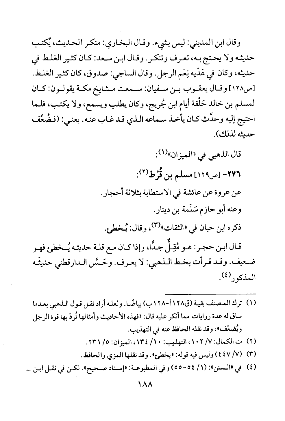(¬١) ترك المصنف بقية (ق ١٢٨ أ-١٢٨ ب) بياضًا. ولعله أراد نقل قول الذهبي بعدما ساق له عدة روايات مما أنكر عليه قال: «فهذه الأحاديث وأمثالها تُردّ بها قوة الرجل ويُضعّف»، وقد نقله الحافظ عنه في التهذيب.