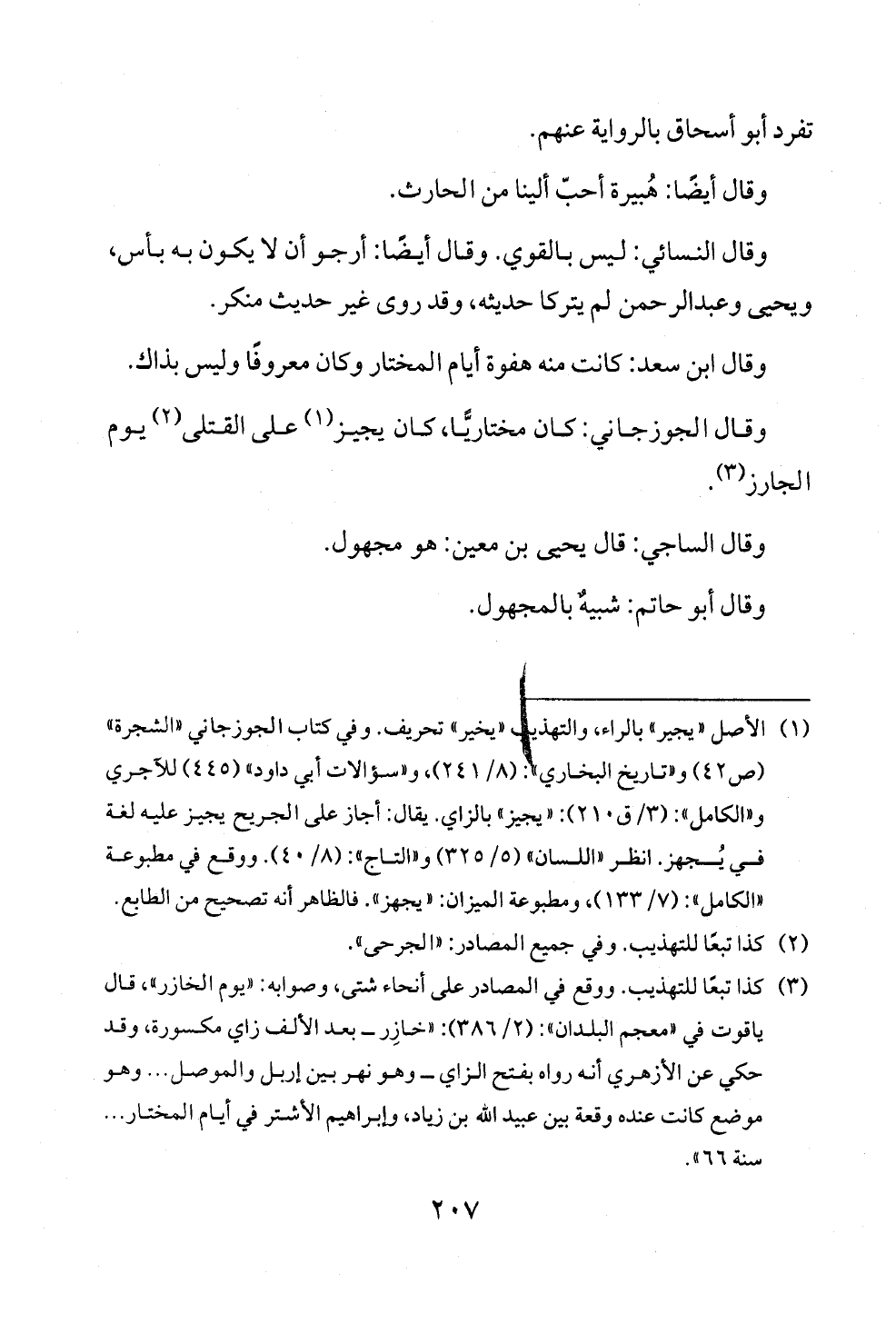(¬١) الأصل «يجير» بالراء، والتهذيب «يخير» تحريف. وفي كتاب الجوزجاني «الشجرة» (ص ٤٢) و «تاريخ البخاري»: (٨/ ٢٤١)، و «سؤالات أبي داود» (٤٤٥) للآجري و «الكامل»: (٣/ق ٢١٠): «يجيز» بالزاي. يقال: أجاز على الجريح يجيز عليه لغة في يُجهز. انظر «اللسان» (٥/ ٣٢٥) و «التاج»: (٨/ ٤٠). ووقع في مطبوعة «الكامل»: (٧/ ١٣٣)، ومطبوعة الميزان: «يجهز». فالظاهر أنه تصحيح من الطابع.