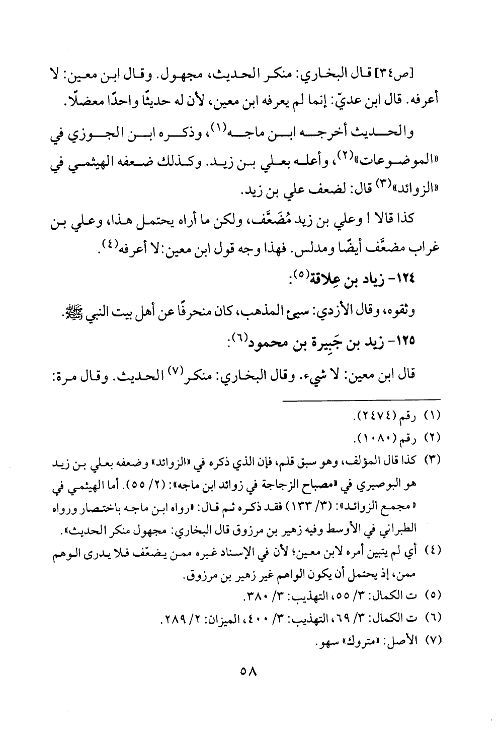 [ص ٣٤] قال البخاري: منكر الحديث، مجهول. وقال ابن معين: لا أعرفه. قال ابن عديّ: إنما لم يعرفه ابن معين، لأن له حديثًا واحدًا معضلًا.