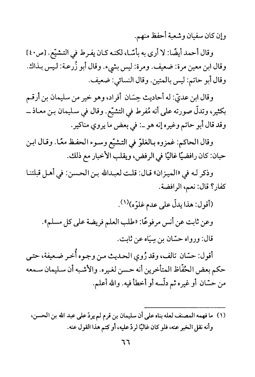 وقال ابن عديّ: له أحاديث حِسَان أفراد، وهو خير من سليمان بن أرقم بكثير، وتدلّ صورته على أنه مُفرط في التشيّع. وقال في سليمان بن معاذ ــ وقد قال أبو حاتم وغيره إنه هو ــ: في بعض ما يروي مناكير.