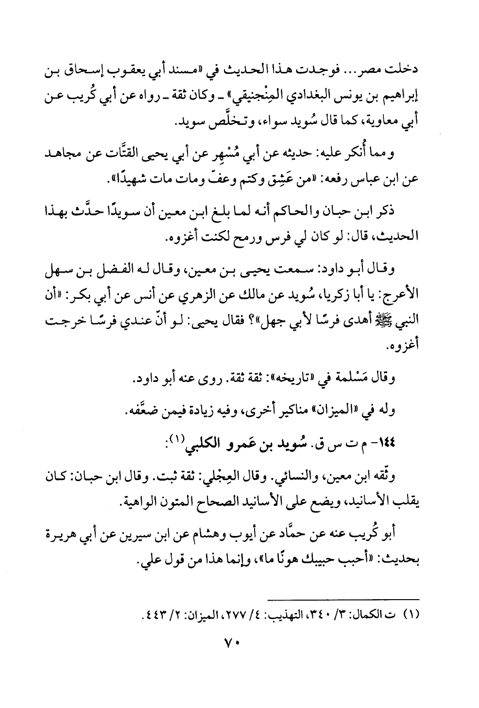 دخلت مصر ... فوجدت هذا الحديث في «مسند أبي يعقوب إسحاق بن إبراهيم بن يونس البغدادي المِنْجنيقي» ــ وكان ثقة ــ رواه عن أبي كُريب عن أبي معاوية، كما قال سُويد سواء، وتخلَّص سويد.
