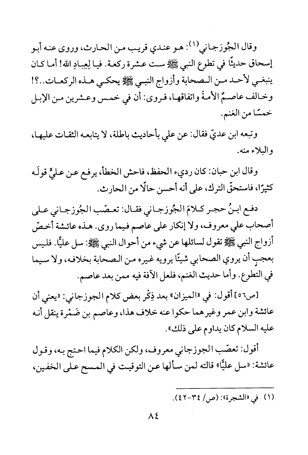 [ص ٥٦] أقول: في «الميزان» بعد ذِكْر بعض كلام الجوزجاني: «يعني أن عائشة وابن عمر وغيرهما حكوا عنه خلاف هذا، وعاصم بن ضَمْرة ينقل أنه عليه السلام كان يداوم على ذلك».