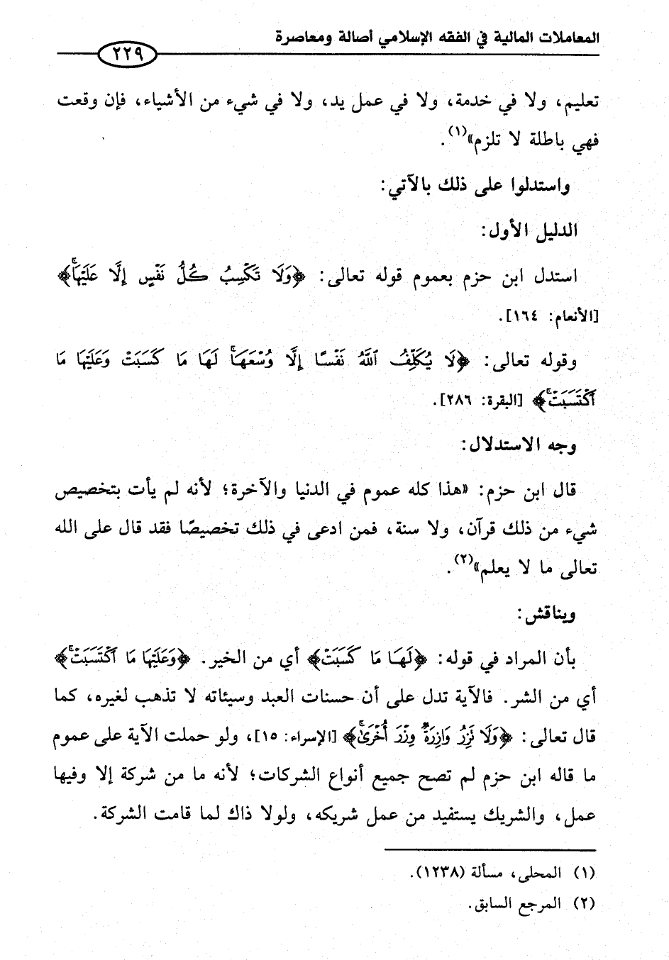 بأن المراد في قوله: {لَهَا مَا كسبَتْ} أي من الخير. {وَعَلَيْهَا مَا اكتسبَتْ} أي من الشر. فالآية تدل على أن حسنات العبد وسيئاته لا تذهب لغيره، كما قال تعالى: {وَلَا تَزِرُ وَازِرَةٌ وِزْرَ أُخْرَى} [الإسراء: ١٥] ولو حملت الآية على عموم ما قاله ابن حزم لم تصح جميع أنواع الشركات؛ لأنه ما من شركة إلا وفيها عمل، والشريك يستفيد من عمل شريكه، ولولا ذاك لما قامت الشركة.