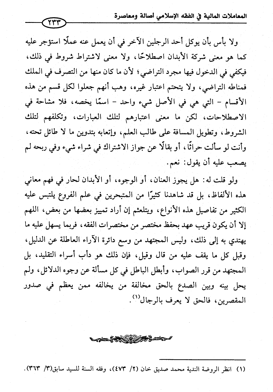 ولا بأس بأن يوكل أحد الرجلين الآخر في أن يعمل عنه عملًا استؤجر عليه كما هو معنى شركة الأبدان اصطلاحًا، ولا معنى لاشتراط شروط في ذلك، فيكفي في الدخول فيها مجرد التراضي؛ لأن ما كان منها من التصرف في الملك فمناطه التراضي، ولا يتحتم اعتبار غيره، وهب أنهم جعلوا لكل قسم من هذه الأقسام -التي هي في الأصل شيء واحد- اسمًا يخصه، فلا مشاحة في الاصطلاحات، لكن ما معنى اعتبارهم لتلك العبارات، وتكلفهم لتلك الشروط، وتطويل المسافة على طالب العلم، وإتعابه بتدوين ما لا طائل تحته، وأنت لو سألت حراثًا، أو بقالًا عن جواز الاشتراك في شراء شيء وفي ربحه لم يصعب عليه أن يقول: نعم.