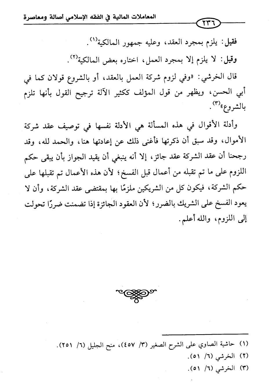 قال الخرشي: "وفي لزوم شركة العمل بالعقد، أو بالشروع قولان كما في أبي الحسن، ويظهر من قول المؤلف ككثير الآلة ترجيح القول بأنها تلزم بالشروع" (¬٣).