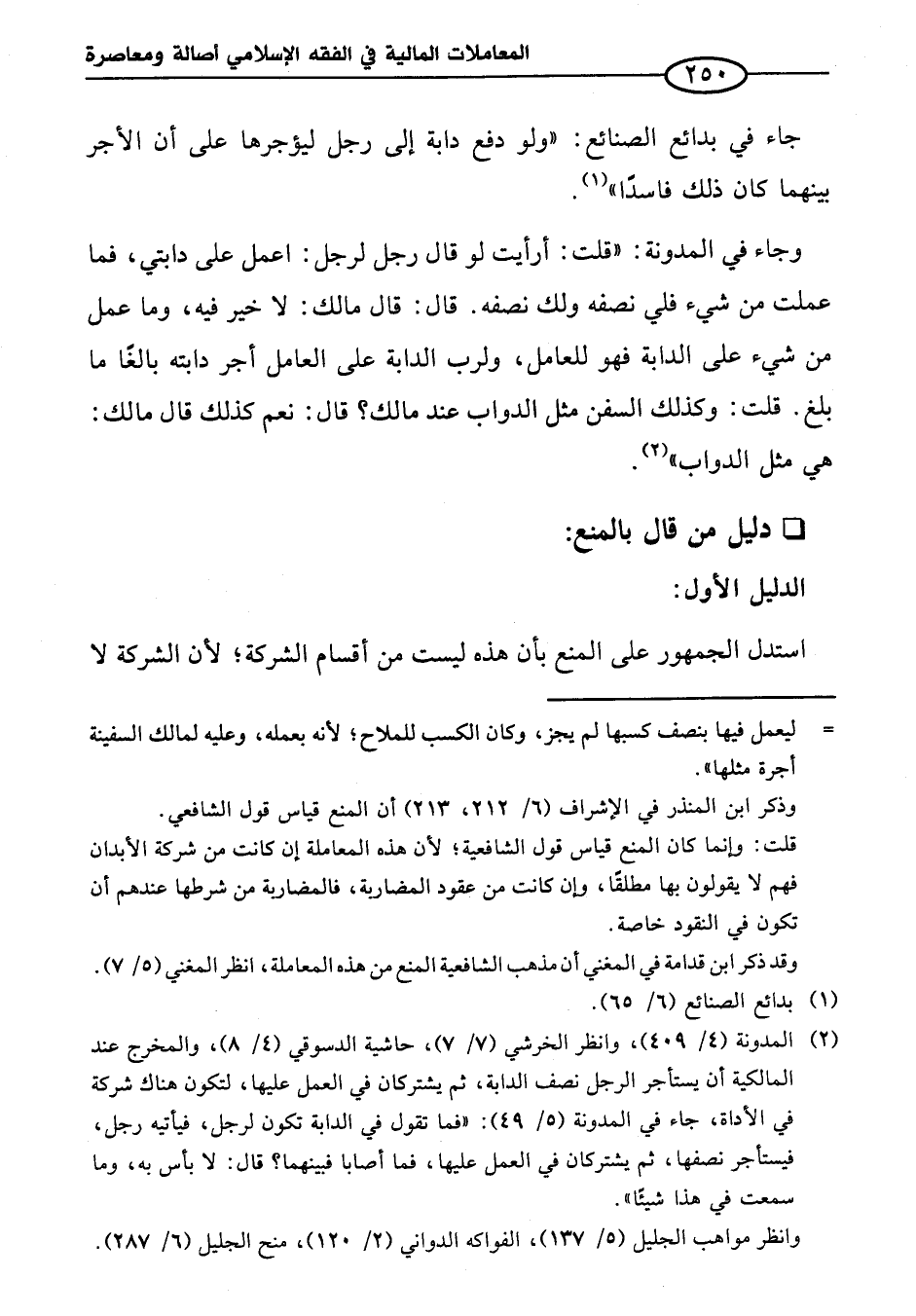 وجاء في المدونة: "قلت: أرأيت لو قال رجل لرجل: اعمل على دابتي، فما عملت من شيء فلي نصفه ولك نصفه. قال: قال مالك: لا خير فيه، وما عمل من شيء على الدابة فهو للعامل، ولرب الدابة على العامل أجر دابته بالغًا ما بلغ. قلت: وكذلك السفن مثل الدواب عند مالك؟ قال: نعم كذلك قال مالك: هي مثل الدواب" (¬٢).