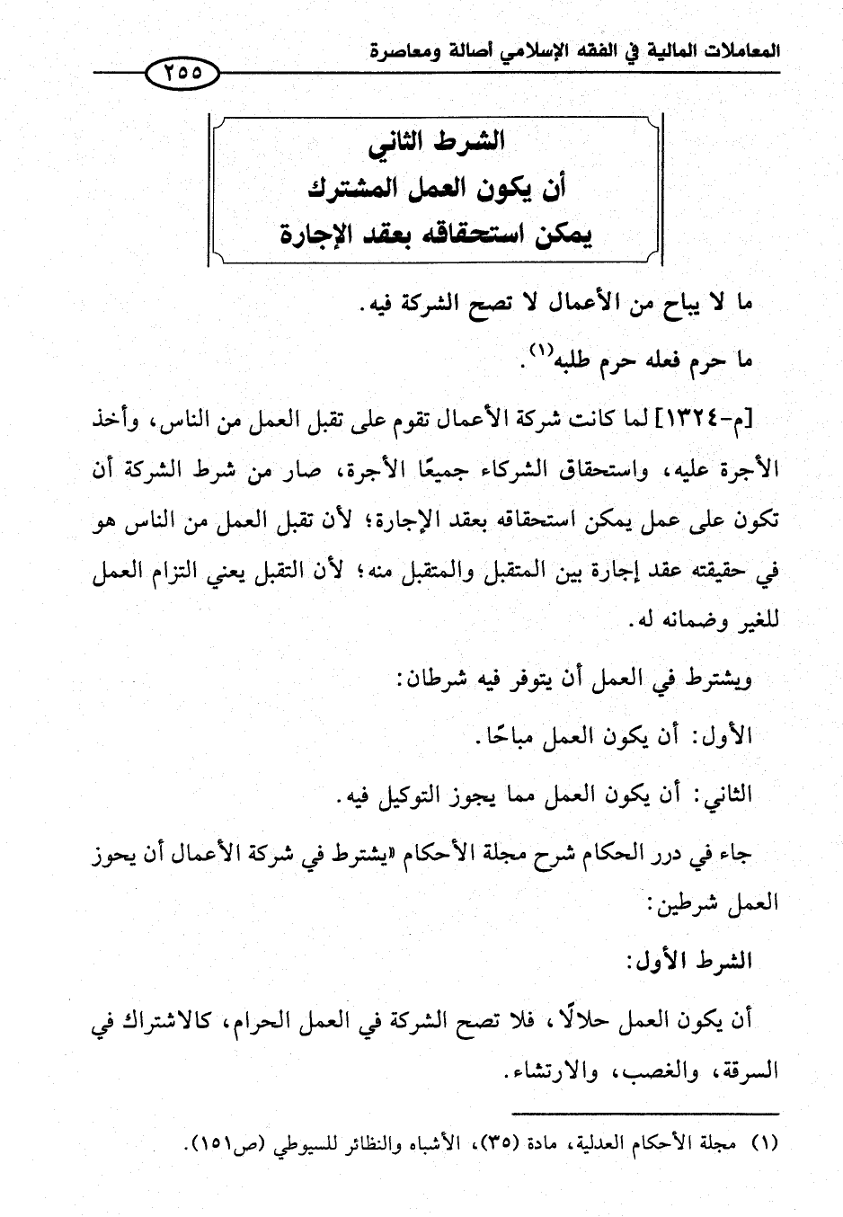 جاء في درر الحكام شرح مجلة الأحكام "يشترط في شركة الأعمال أن يحوز العمل شرطين: