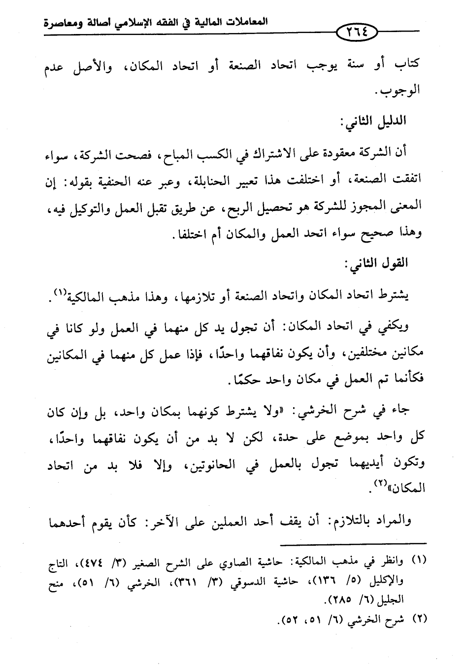 جاء في شرح الخرشي: "ولا يشترط كونهما بمكان واحد، بل وإن كان كل واحد بموضع على حدة، لكن لا بد من أن يكون نفاقهما واحدًا، وتكون أيديهما تجول بالعمل في الحانوتين، وإلا فلا بد من اتحاد المكان" (¬٢).