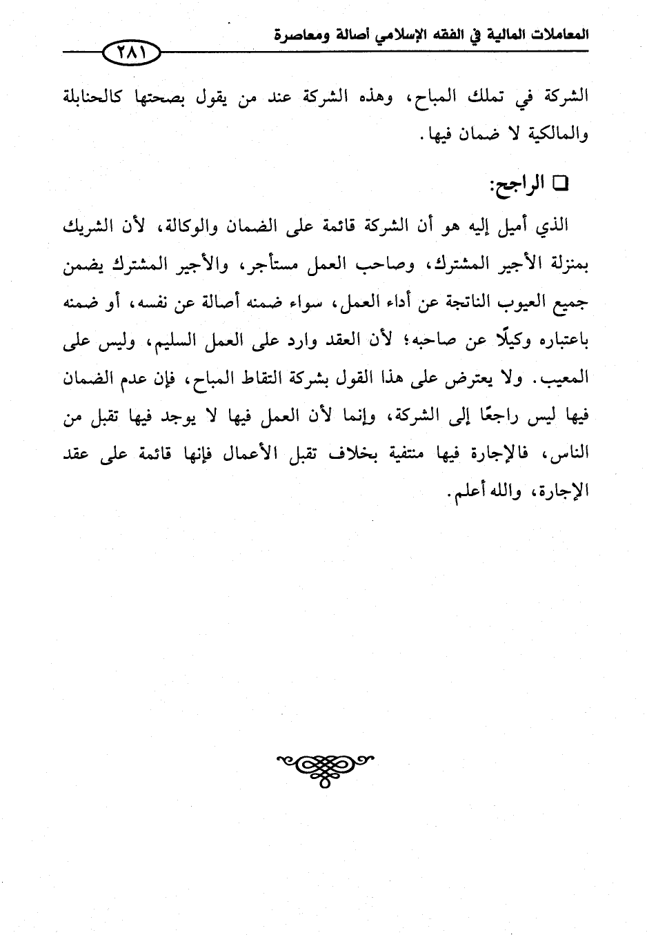 الذي أميل إليه هو أن الشركة قائمة على الضمان والوكالة؛ لأن الشريك بمنزلة الأجير المشترك، وصاحب العمل مستأجر، والأجير المشترك يضمن جميع العيوب الناتجة عن أداء العمل، سواء ضمنه أصالة عن نفسه، أو ضمنه باعتباره وكيلًا عن صاحبه؛ لأن العقد وارد على العمل السليم، وليس على المعيب. ولا يعترض على هذا القول بشركة التقاط المباح، فإن عدم الضمان فيها ليس راجعًا إلى الشركة، وإنما لأن العمل فيها لا يوجد فيها تقبل من الناس، فالإجارة فيها منتفية بخلاف تقبل الأعمال فإنها قائمة على عقد الإجارة، والله أعلم.