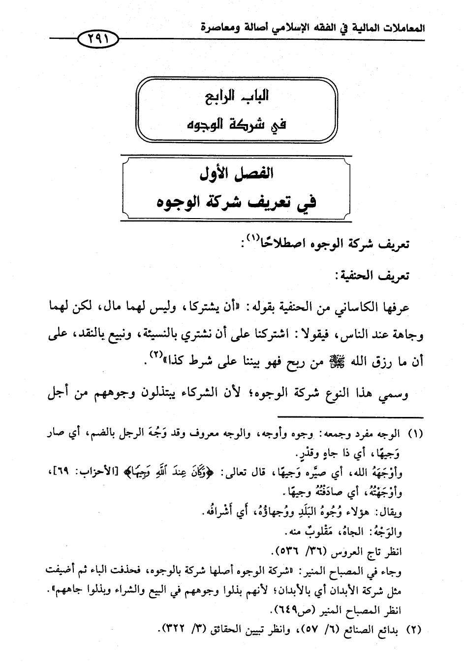 عرفها الكاساني من الحنفية بقوله: "أن يشتركا، وليس لهما مال، لكن لهما وجاهة عند الناس، فيقولا: اشتركنا على أن نشتري بالنسيئة، ونبيع بالنقد، على أن ما رزق الله سبحانه وتعالى من ربح فهو بيننا على شرط كذا" (¬٢).