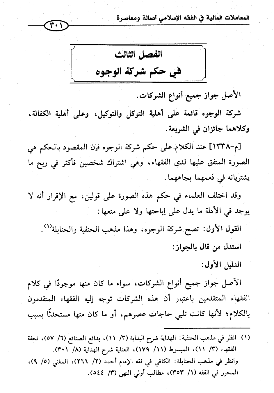 [م - ١٣٣٨] عند الكلام على حكم شركة الوجوه فإن المقصود بالحكم هي الصورة المتفق عليها لدى الفقهاء، وهي اشتراك شخصين فأكثر في ربح ما يشتريانه في ذممهما بجاههما.