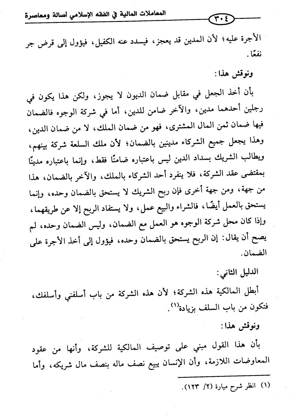 بأن أخذ الجعل في مقابل ضمان الديون لا يجوز، ولكن هذا يكون في رجلين أحدهما مدين، والآخر ضامن للدين، أما في شركة الوجوه فالضمان فيها ضمان ثمن المال المشترى، فهو من ضمان الملك، لا من ضمان الدين، وهذا يجعل جميع الشركاء مدينين بالضمان؛ لأن ملك السلعة شركة بينهم، ويطالب الشريك بسداد الدين ليس باعتباره ضامنا فقط، وإنما باعتباره مدينا بمقتضى عقد الشركة، فلا ينفرد أحد الشركاء بالملك، والآخر بالضمان، هذا من جهة، ومن جهة أخرى فإن ربح الشريك لا يستحق بالضمان وحده، وإنما يستحق بالعمل أيضًا، فالشراء والبيع عمل، ولا يستفاد الربح إلا عن طريقهما، وإذا كان محل شركة الوجوه هو العمل مع الضمان، وليس الضمان وحده، لم يصح أن يقال: إن الربح يستحق بالضمان وحده، فيؤول إلى أخذ الأجرة على الضمان.