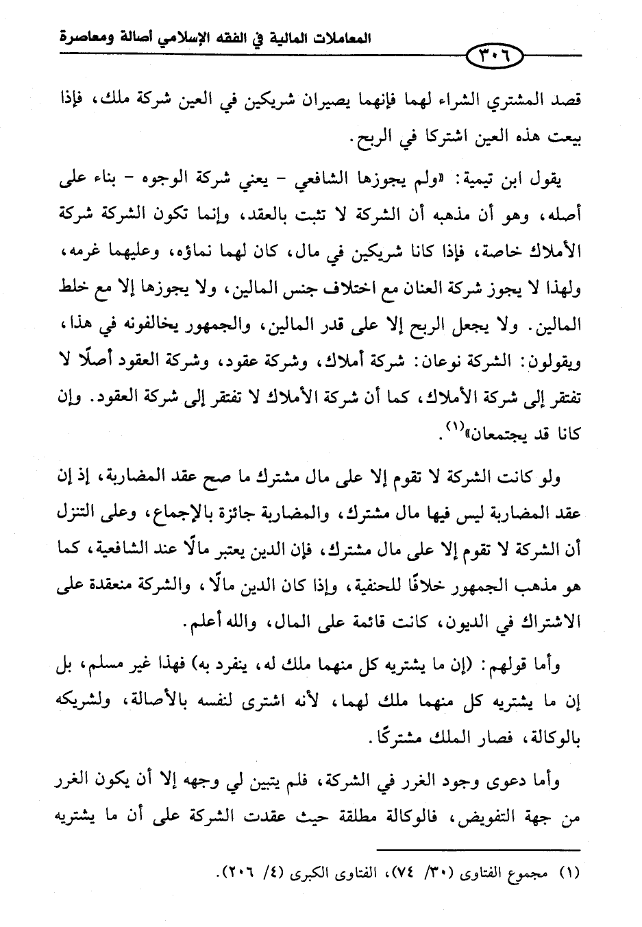 يقول ابن تيمية: "ولم يجوزها الشافعي -يعني شركة الوجوه- بناء على أصله، وهو أن مذهبه أن الشركة لا تثبت بالعقد، وإنما تكون الشركة شركة الأملاك خاصة، فإذا كانا شريكين في مال، كان لهما نماؤه، وعليهما غرمه، ولهذا لا يجوز شركة العنان مع اختلاف جنس المالين، ولا يجوزها إلا مع خلط المالين. ولا يجعل الربح إلا على قدر المالين، والجمهور يخالفونه في هذا، ويقولون: الشركة نوعان: شركة أملاك، وشركة عقود، وشركة العقود أصلًا لا تفتقر إلى شركة الأملاك، كما أن شركة الأملاك لا تفتقر إلى شركة العقود. وإن كانا قد يجتمعان" (¬١).