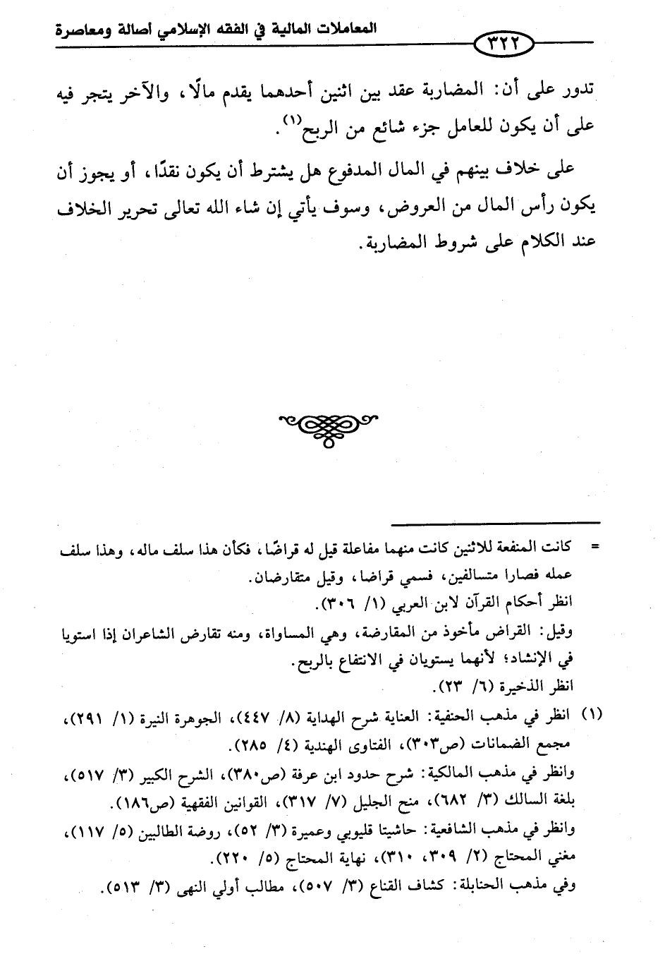 تدور على أن: المضاربة عقد بين اثنين أحدهما يقدم مالًا، والآخر يتجر فيه على أن يكون للعامل جزء شائع من الربح (¬١).