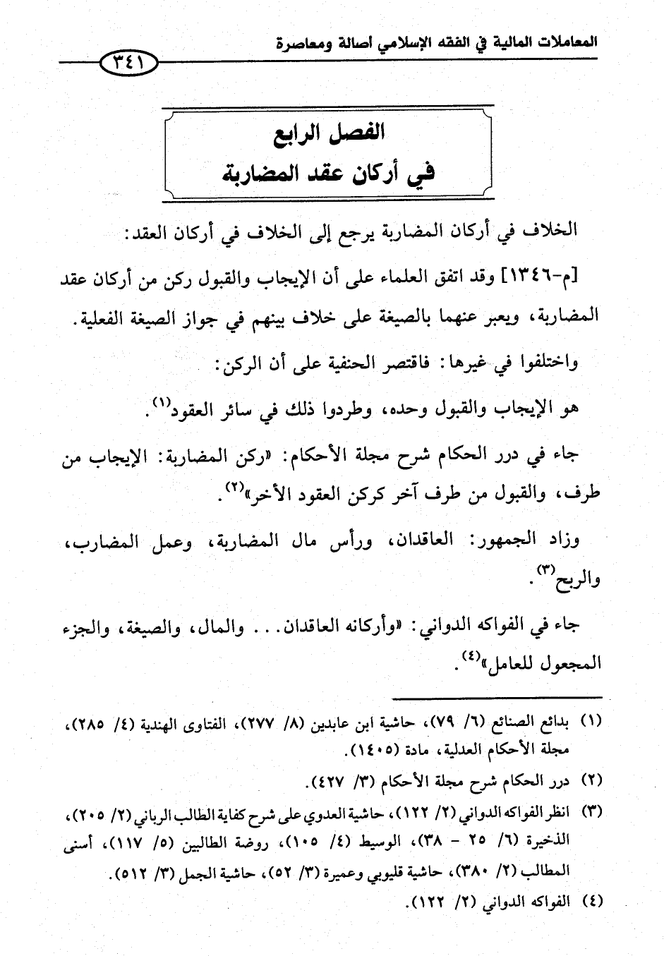 جاء في درر الحكام شرح مجلة الأحكام: "ركن المضاربة: الإيجاب من طرف، والقبول من طرف آخر كركن العقود الأخر" (¬٢).