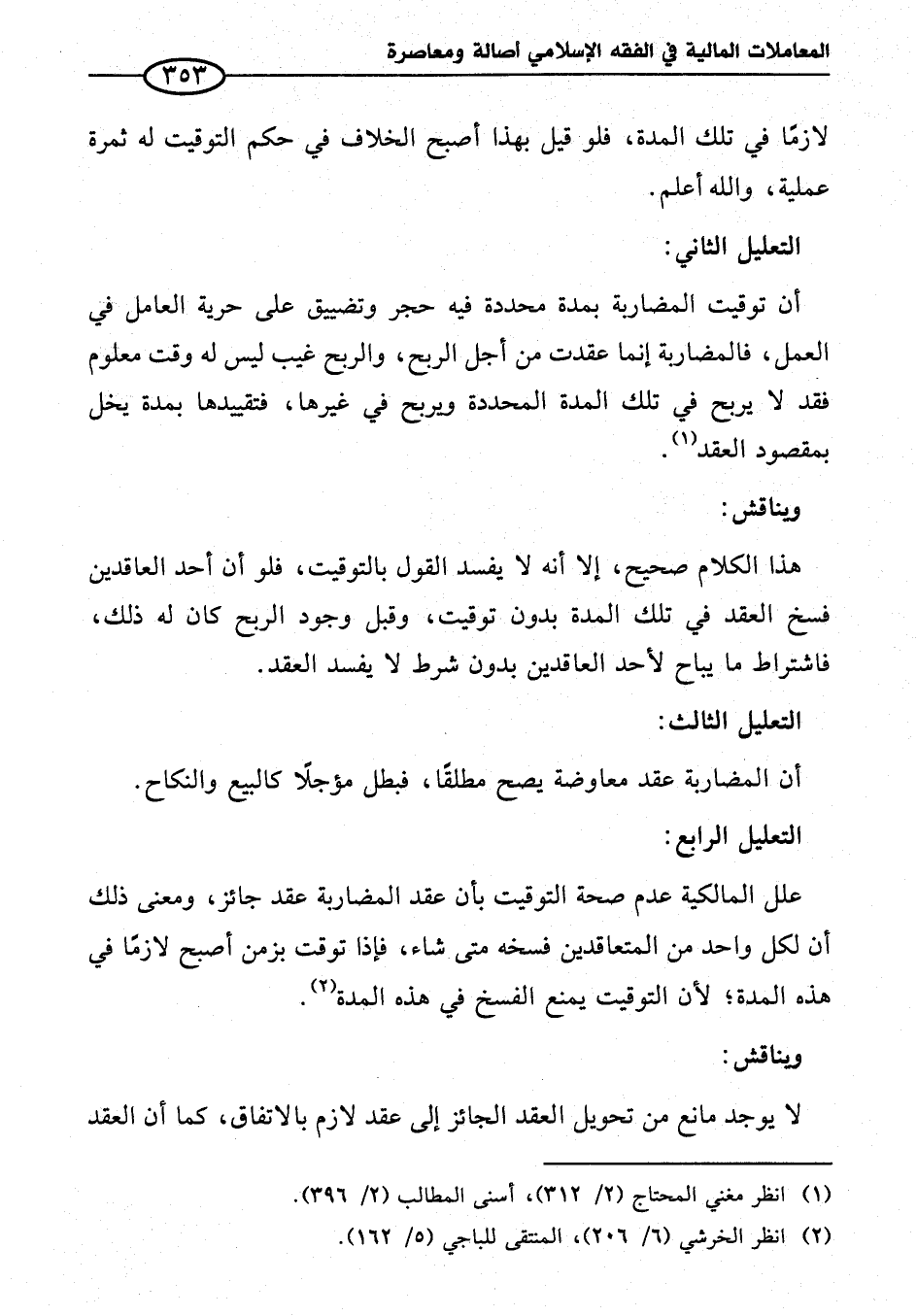 علل المالكية عدم صحة التوقيت بأن عقد المضاربة عقد جائز، ومعنى ذلك أن لكل واحد من المتعاقدين فسخه متى شاء، فإذا توقت بزمن أصبح لازما في هذه المدة؛ لأن التوقيت يمنع الفسخ في هذه المدة (¬٢).