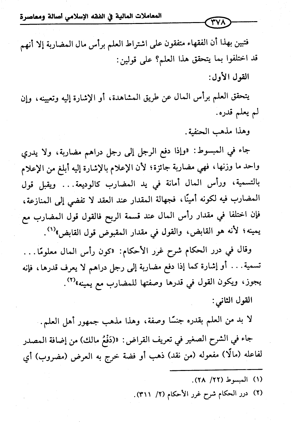 فتبين بهذا أن الفقهاء متفقون على اشتراط العلم برأس مال المضاربة إلا أنهم قد اختلفوا بما يتحقق هذا العلم؟ على قولين: