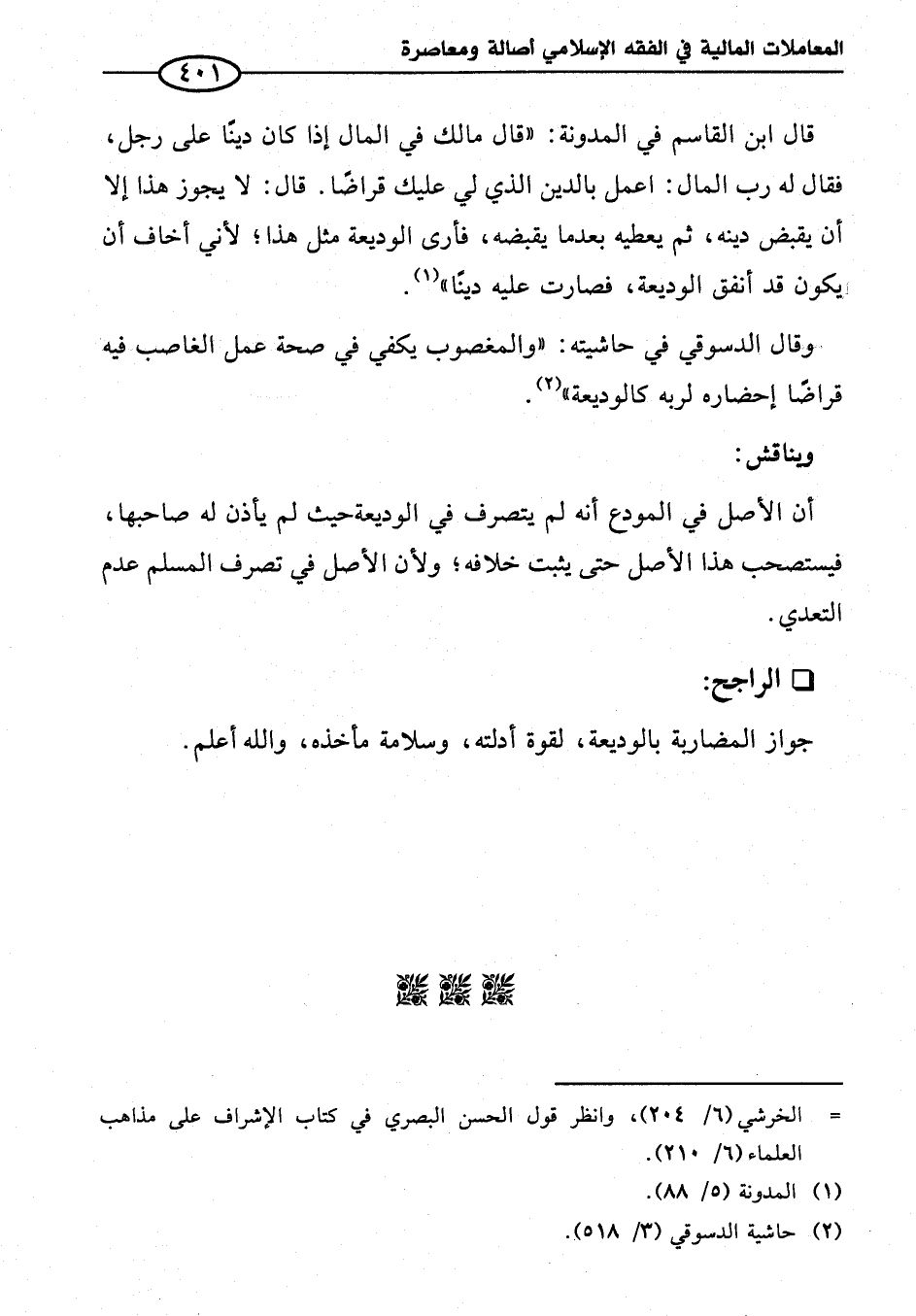 قال ابن القاسم في المدونة: "قال مالك في المال إذا كان دينا على رجل، فقال له رب المال: اعمل بالدين الذي لي عليك قراضًا. قال: لا يجوز هذا إلا أن يقبض دينه، ثم يعطيه بعد ما يقبضه، فأرى الوديعة مثل هذا؛ لأني أخاف أن يكون قد أنفق الوديعة، فصارت عليه دينا" (¬١).