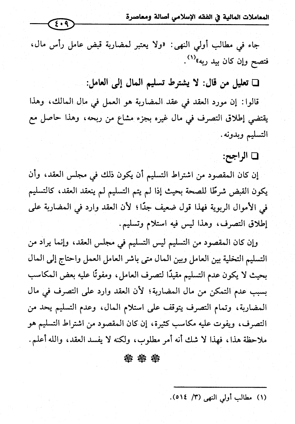 وإن كان المقصود من التسليم ليس التسليم في مجلس العقد، وإنما يراد من التسليم التخلية بين العامل وبين المال متى باشر العامل العمل واحتاج إلى المال بحيث لا يكون عدم التسليم مقيدًا لتصرف العامل، ومفوتًا عليه بعض المكاسب بسبب عدم التمكن من مال المضاربة؛ لأن العقد وارد على التصرف في مال المضاربة، وتمام التصرف يتوقف على استلام المال، وعدم التسليم يحد من التصرف، ويفوت عليه مكاسب كثيرة، إن كان المقصود من اشتراط التسليم هو ملاحظة هذا، فهذا لا شك أنه أمر مطلوب، ولكنه لا يفسد العقد، والله أعلم.