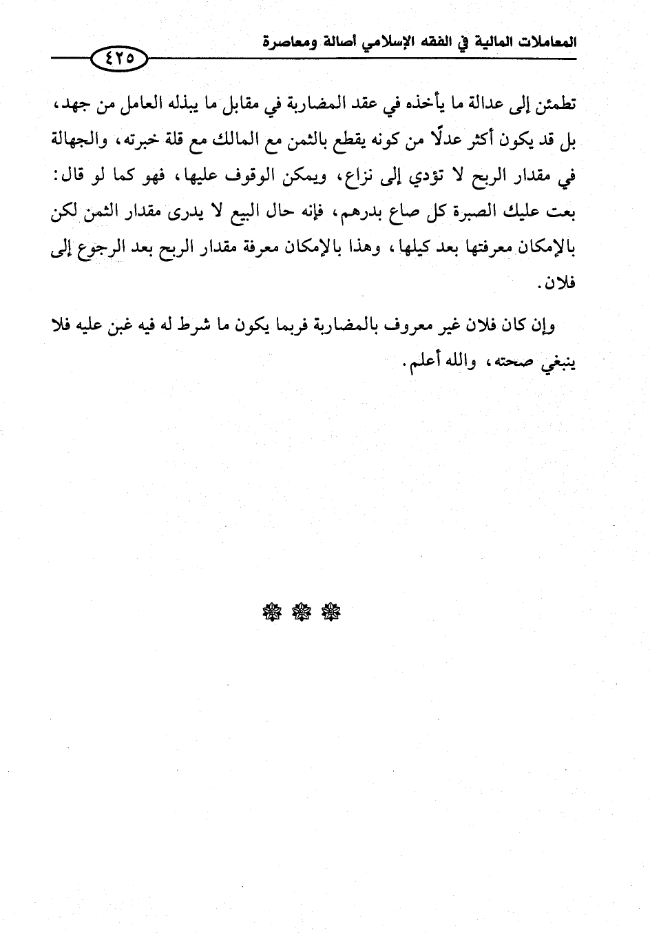 تطمئن إلى عدالة ما يأخذه في عقد المضاربة في مقابل ما يبذله العامل من جهد، بل قد يكون أكثر عدلاً من كونه يقطع بالثمن مع المالك مع قلة خبرته، والجهالة في مقدار الربح لا تؤدي إلى نزاع، ويمكن الوقوف عليها، فهو كما لو قال: بعت عليك الصبرة كل صاع بدرهم، فإنه حال البيع لا يدرى مقدار الثمن لكن بالإمكان معرفتها بعد كيلها، وهذا بالإمكان معرفة مقدار الربح بعد الرجوع إلى فلان.