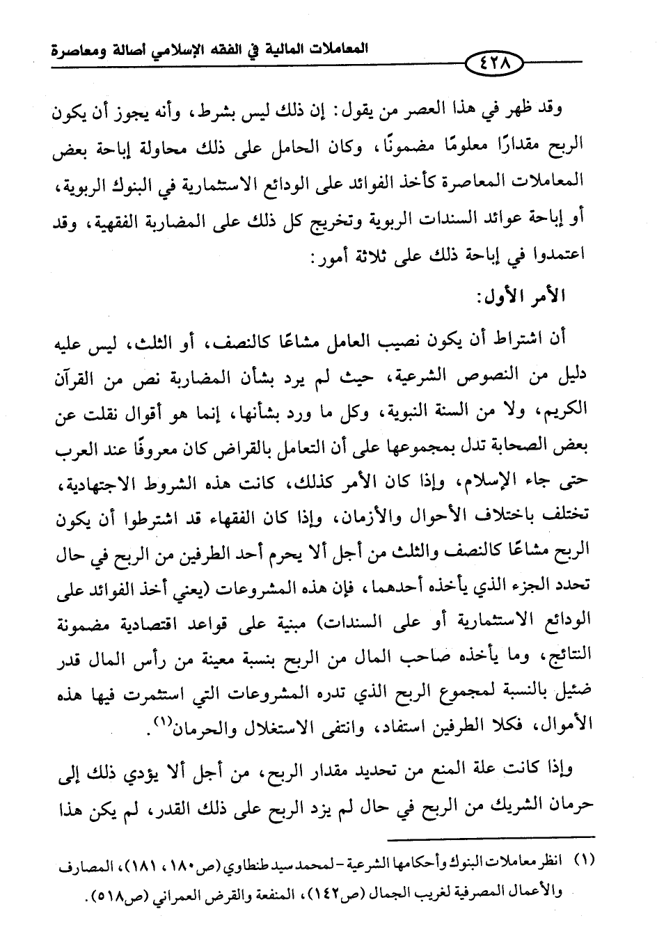 أن اشتراط أن يكون نصيب العامل مشاعًا كالنصف، أو الثلث، ليس عليه دليل من النصوص الشرعية، حيث لم يرد بشأن المضاربة نص من القرآن الكريم، ولا من السنة النبوية، وكل ما ورد بشأنها، إنما هو أقوال نقلت عن بعض الصحابة تدل بمجموعها على أن التعامل بالقراض كان معروفاً عند العرب حتى جاء الإِسلام، وإذا كان الأمر كذلك، كانت هذه الشروط الاجتهادية، تختلف باختلاف الأحوال والأزمان، وإذا كان الفقهاء قد اشترطوا أن يكون الربح مشاعًا كالنصف والثلث من أجل ألا يحرم أحد الطرفين من الربح في حال تحدد الجزء الذي يأخذه أحدهما، فإن هذه المشروعات (يعني أخذ الفوائد على الودائع الاستثمارية أو على السندات) مبنية على قواعد اقتصادية مضمونة النتائج، وما يأخذه صاحب المال من الربح بنسبة معينة من رأس المال قدر ضئيل بالنسبة لمجموع الربح الذي تدره المشروعات التي استثمرت فيها هذه الأموال، فكلا الطرفين استفاد، وانتفى الاستغلال والحرمان (¬١).