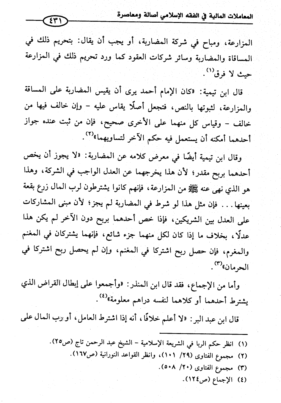 وقال ابن تيمية أيضًا في معرض كلامه عن المضاربة: "لا يجوز أن يخص أحدهما بربح مقدر؛ لأن هذا يخرجهما عن العدل الواجب في الشركة، وهذا هو الذي نهى عنه - صلى الله عليه وسلم - من المزارعة، فإنهم كانوا يشترطون لرب المال زرع بقعة بعينها ... فإن مثل هذا لو شرط في المضاربة لم يجز؛ لأن مبنى المشاركات على العدل بين الشريكين، فإذا خص أحدهما بربح دون الآخر لم يكن هذا عدلاً، بخلاف ما إذا كان لكل منهما جزء شائع، فإنهما يشتركان في المغنم والمغرم، فإن حصل ربح اشتركا في المغنم، وإن لم يحصل ربح اشتركا في الحرمان" (¬٣).