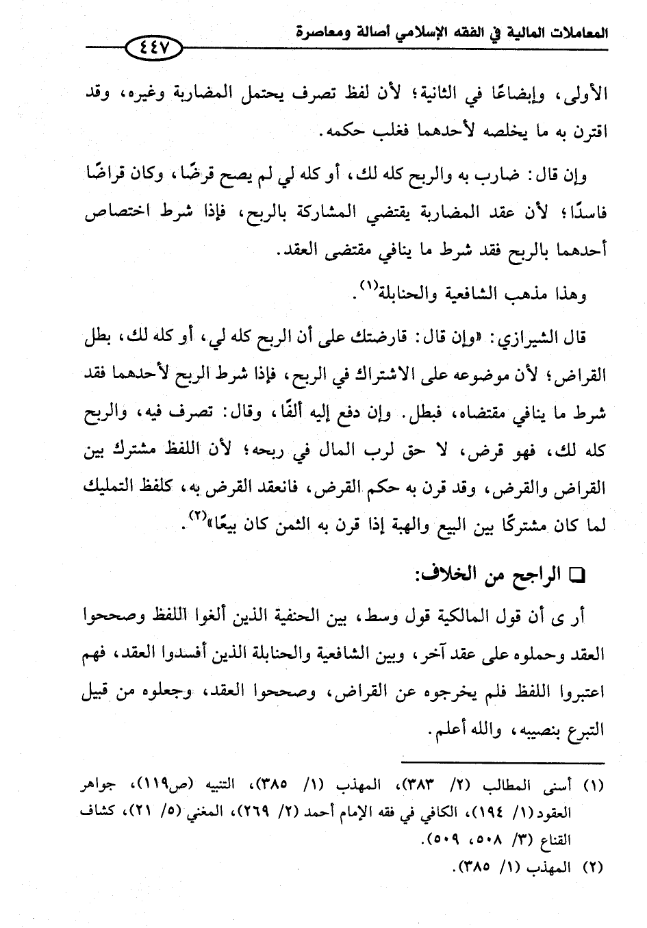 أرى أن قول المالكية قول وسط، بين الحنفية الذين ألغوا اللفظ وصححوا العقد وحملوه على عقد آخر، وبين الشافعية والحنابلة الذين أفسدوا العقد، فهم اعتبروا اللفظ فلم يخرجوه عن القراض، وصححوا العقد، وجعلوه من قبيل التبرع بنصيبه، والله أعلم.