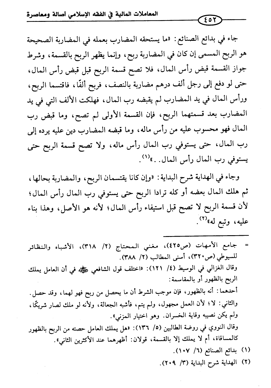 جاء في بدائع الصنائع: "ما يستحقه المضارب بعمله في المضاربة الصحيحة هو الربح المسمى إن كان في المضاربة ربح، وإنما يظهر الربح بالقسمة، وشرط جواز القسمة قبض رأس المال، فلا تصح قسمة الربح قبل قبض رأس المال، حتى لو دفع إلى رجل ألف درهم مضاربة بالنصف، فربح ألفاً، فاقتسما الربح، ورأس المال في يد المضارب لم يقبضه رب المال، فهلكت الألف التي في يد المضارب بعد قسمتهما الربح، فإن القسمة الأولى لم تصح، وما قبض رب المال فهو محسوب عليه من رأس ماله، وما قبضه المضارب دين عليه يرده إلى رب المال، حتى يستوفي رب المال رأس ماله، ولا تصح قسمة الربح حتى يستوفي رب المال رأس المال .. " (¬١).
