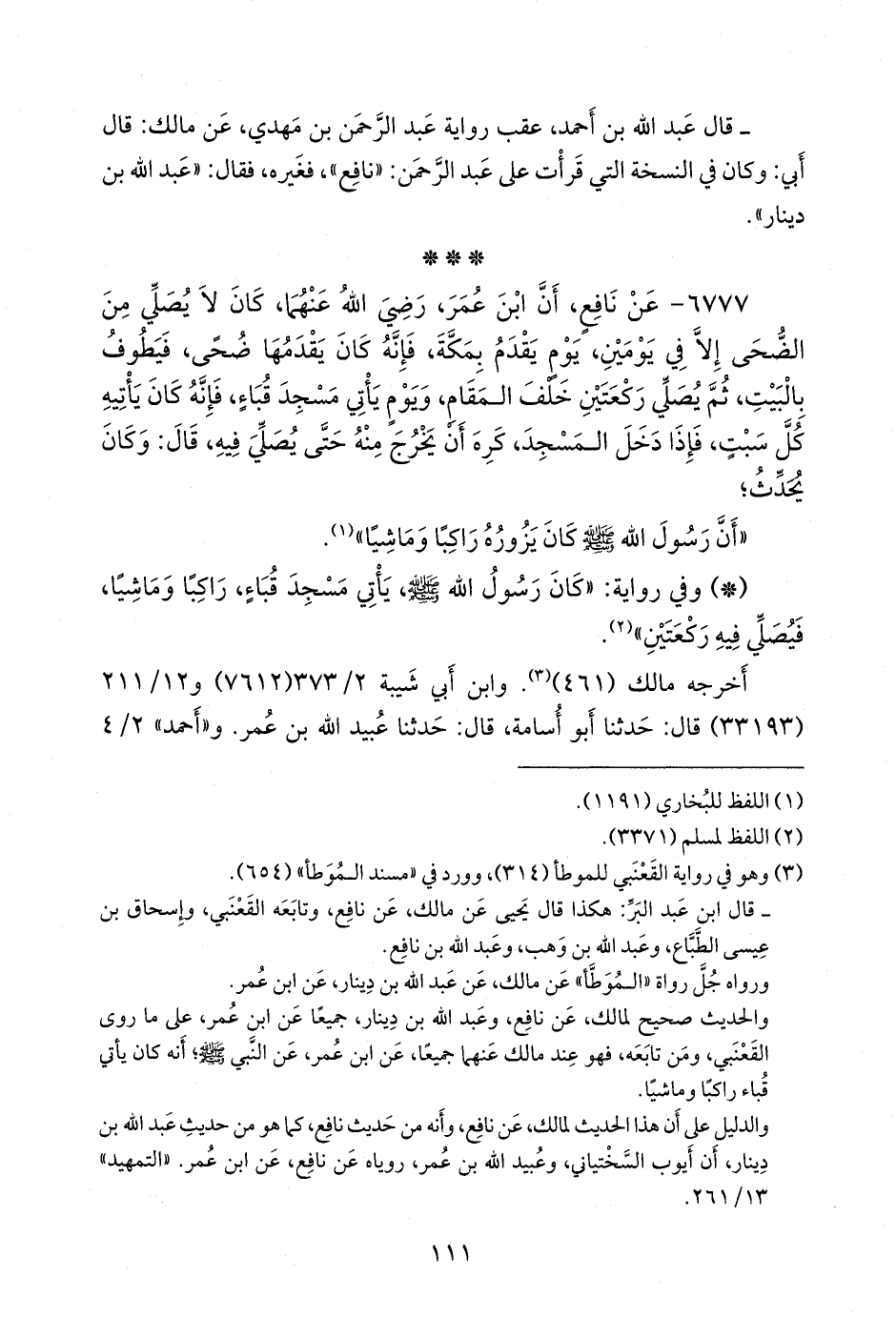 والحديث صحيح لمالك، عن نافع، وعبد الله بن دينار، جميعا عن ابن عمر، على ما روى القَعنَبي، ومن تابعه، فهو عند مالك عنهما جميعا، عن ابن عمر، عن النبي صَلى الله عَليه وسَلم؛ أنه كان يأتي قباء راكبا وماشيا.